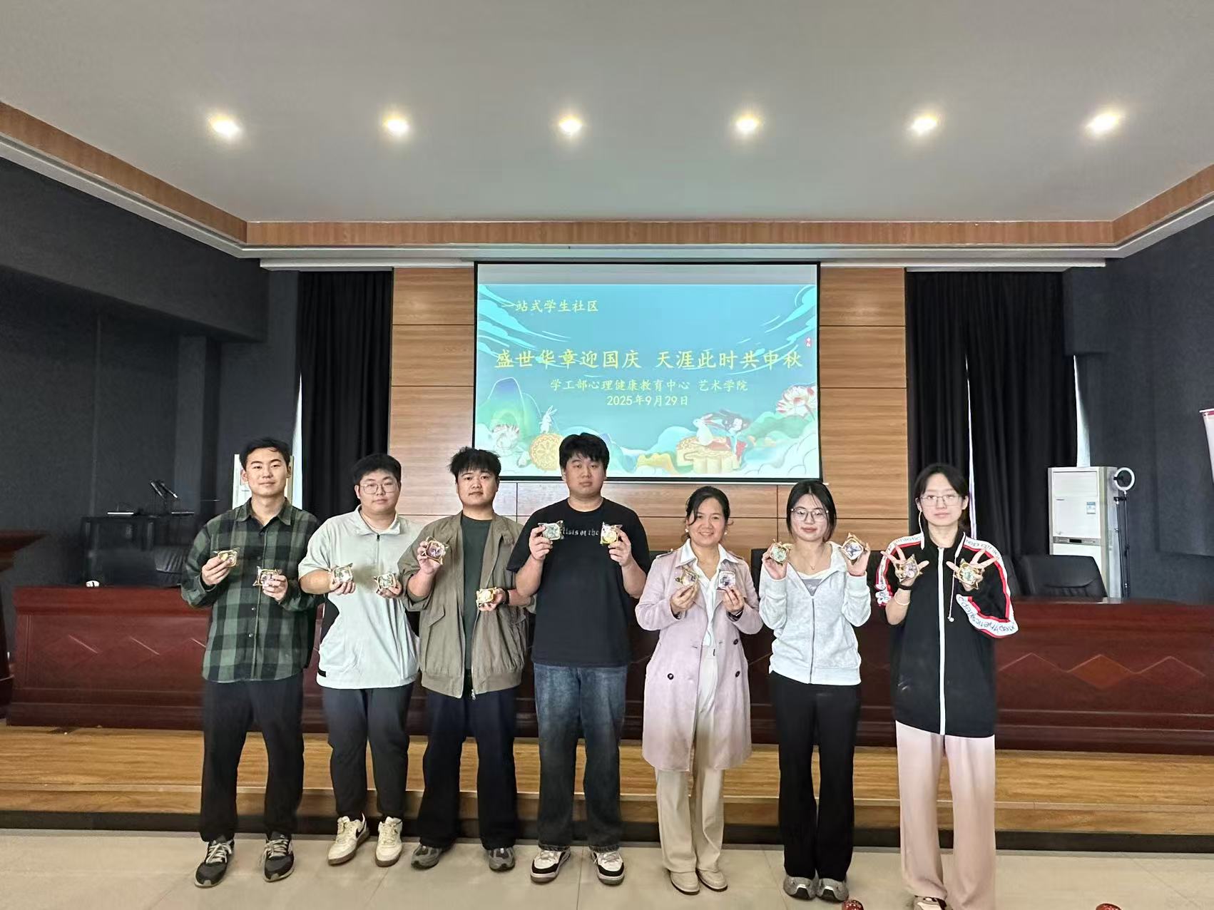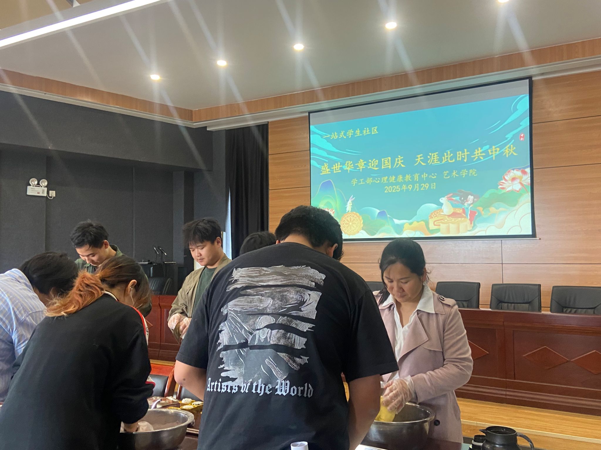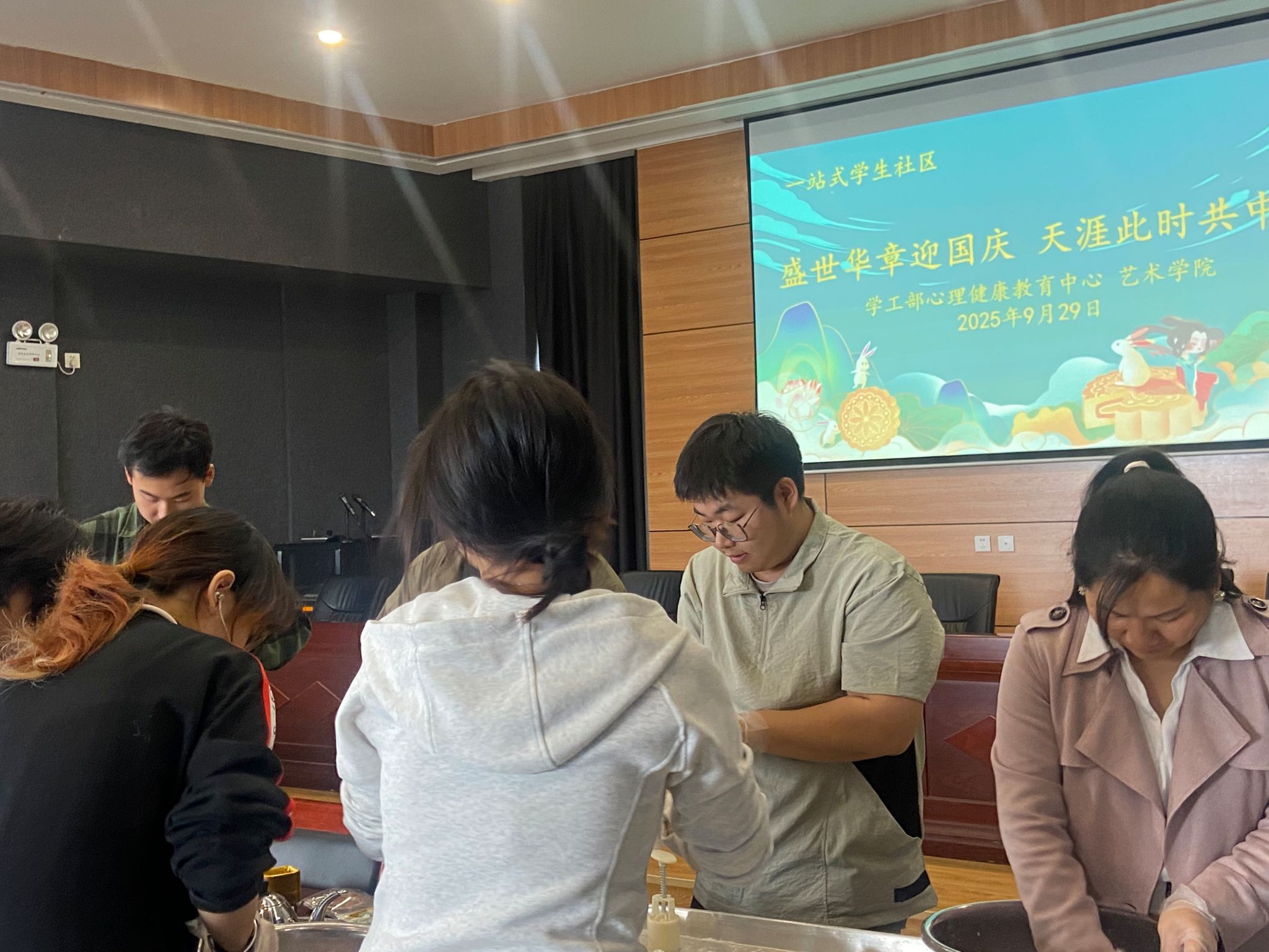 秋高气爽,丹桂飘香。在2025年国庆节与中秋节即将双双来临之际,为弘扬中华优秀传统文化,丰富校园文化生活,增进师生情感,艺术学院于9月29日在秦汉校园举办了“盛世华章迎国庆 天涯此时共中秋”师生共做月饼主题活动。学院团委书记赵统堂、心理健康教育中心刘朋、辅导员王妤和部分学生代表参加了此次活动,活动现场欢声笑语,其乐融融,洋溢着浓厚的节日氛围。