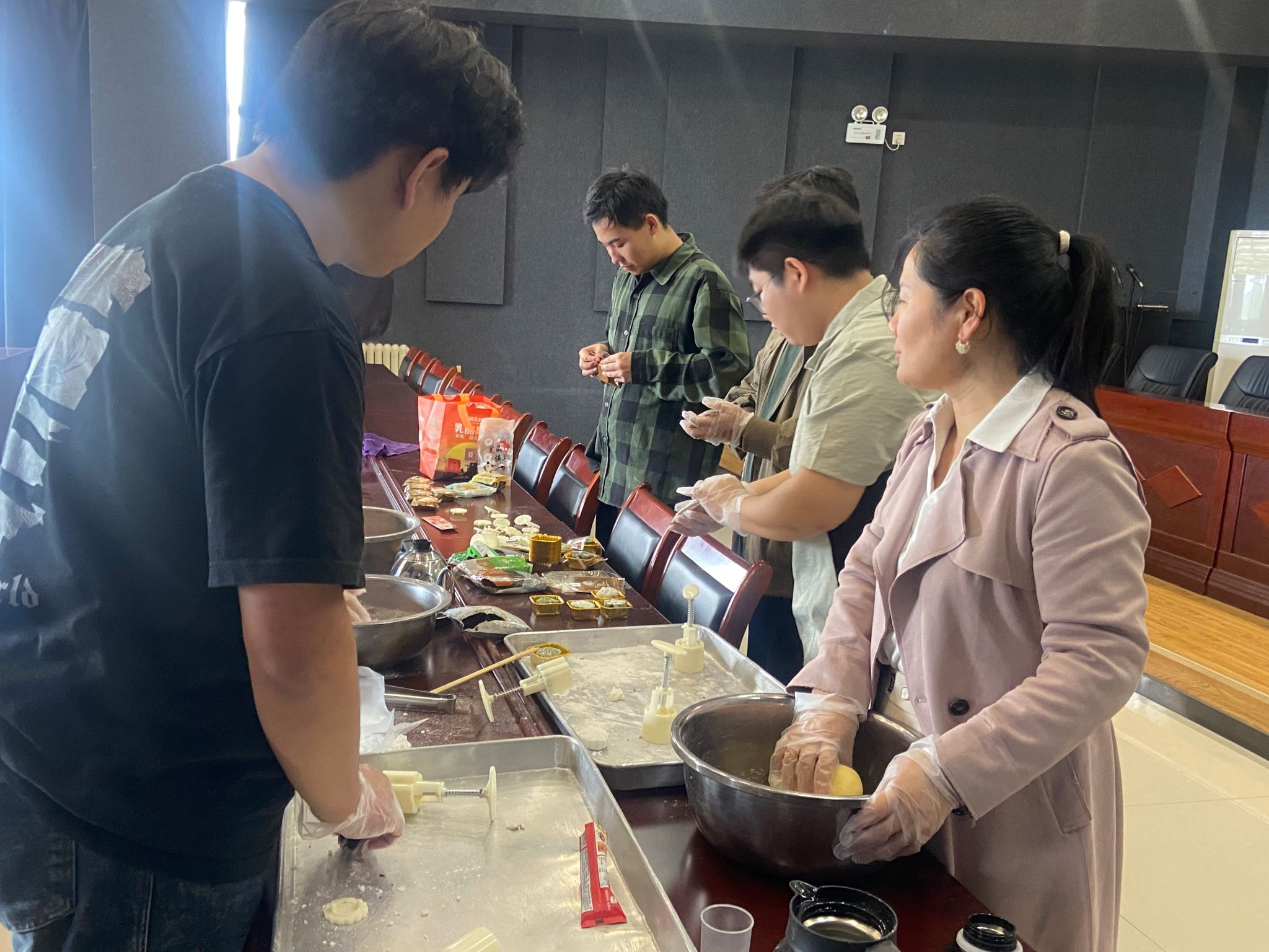 在亲手实践环节,师生们洗净双手,戴上手套,纷纷化身“糕点师”。大家自由组合,分工协作:有的负责将预拌粉揉成光滑柔软的面团;有的小心翼翼地将豆沙、莲蓉、黑芝麻等丰富馅料称重分团;最精彩的当数压模时刻,当同学们将包好馅料的面团放入各式各样的模具中,轻轻一压,一个个印有“福”“团圆”“花好月圆”等精美图案的月饼便脱模而出,栩栩如生。现场惊叹声、欢笑声此起彼伏活动中,老师们不再是课堂上传授知识的严师,而是与同学们并肩合作的伙伴。大家一边制作月饼,一边畅谈家乡的中秋习俗,分享国庆假期的计划,交流学习与生活的点滴。许多同学表示,这是他们第一次亲手制作月饼,感觉特别有意义。参加活动的贾俊杰同学兴奋地说:“能和老师、同学们一起做月饼,感觉特别温暖。这不仅让我学到了新技能,更深刻地感受到了传统文化的魅力,这个中秋节的记忆注定与众不同。”。