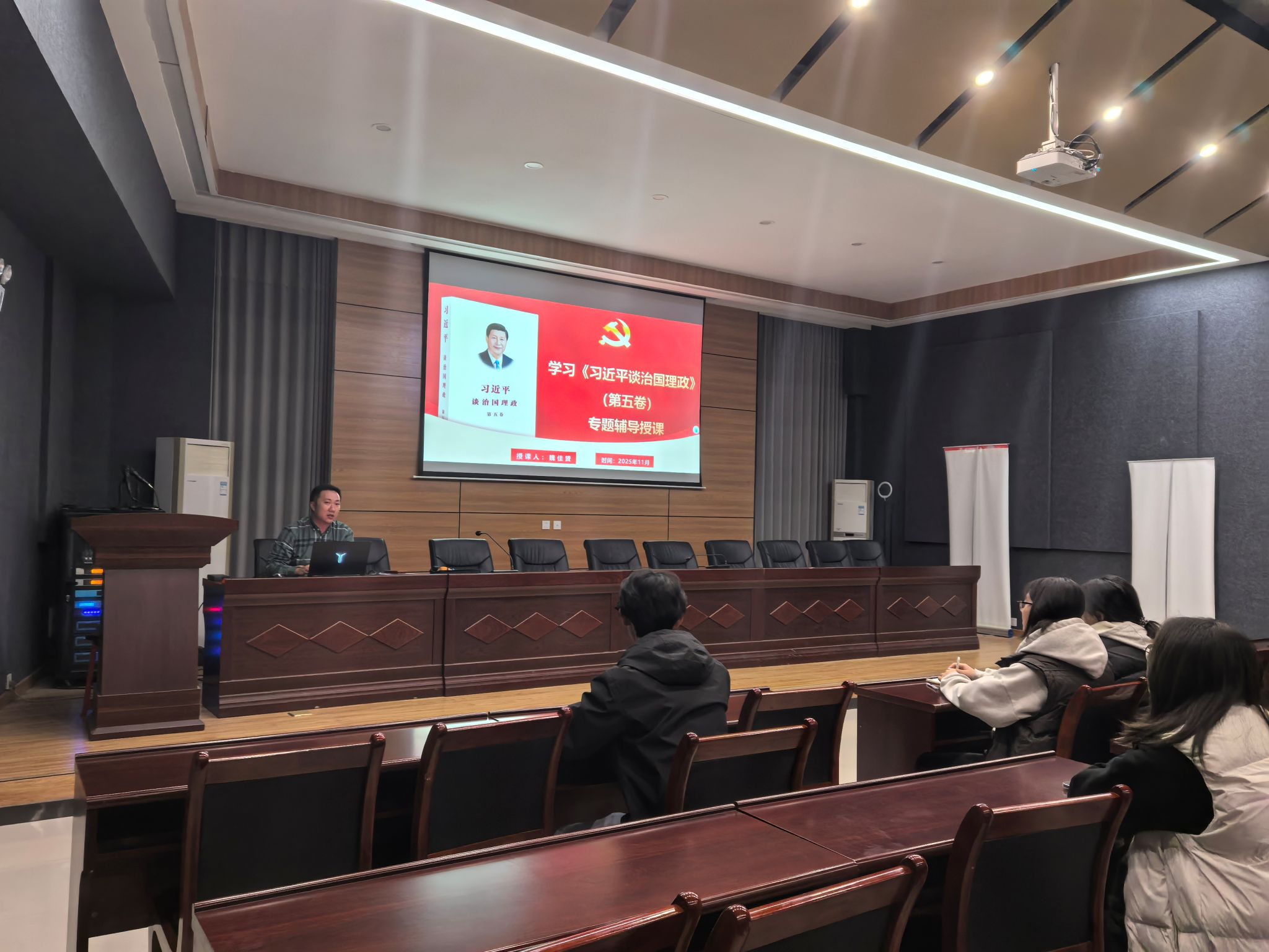 随后,魏佳赟围绕《习近平谈治国理政》第五卷的核心要义展开详细讲解。他提到,要以中国式现代化全面推进强国建设、民族复兴伟业,深刻认识推进中国式现代化是一个系统工程,需要统筹兼顾、系统谋划、整体推进;改革开放是“当代中国最显著的特征”,要续写新时代进一步全面深化改革的壮丽篇章;“两个结合”是取得成功的“最大法宝”,要在“立根铸魂、守正创新”中推进党的理论创新和实践创新。此外,还特别强调了书中关于外交方面坚持“三大全球倡议”、凝聚“全球南方”力量、积极推动构建人类命运共同体的重要论述。