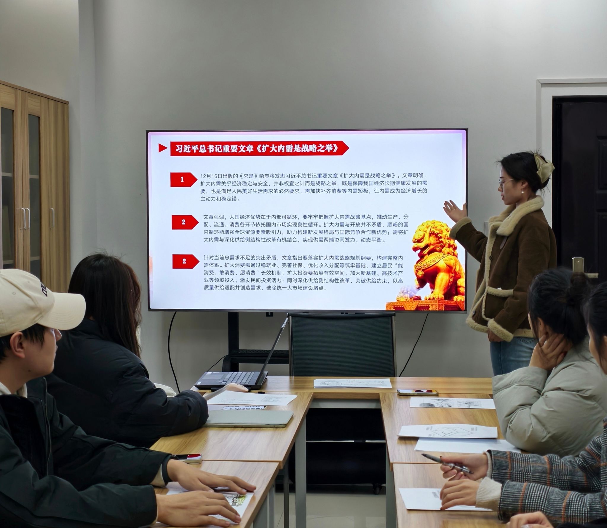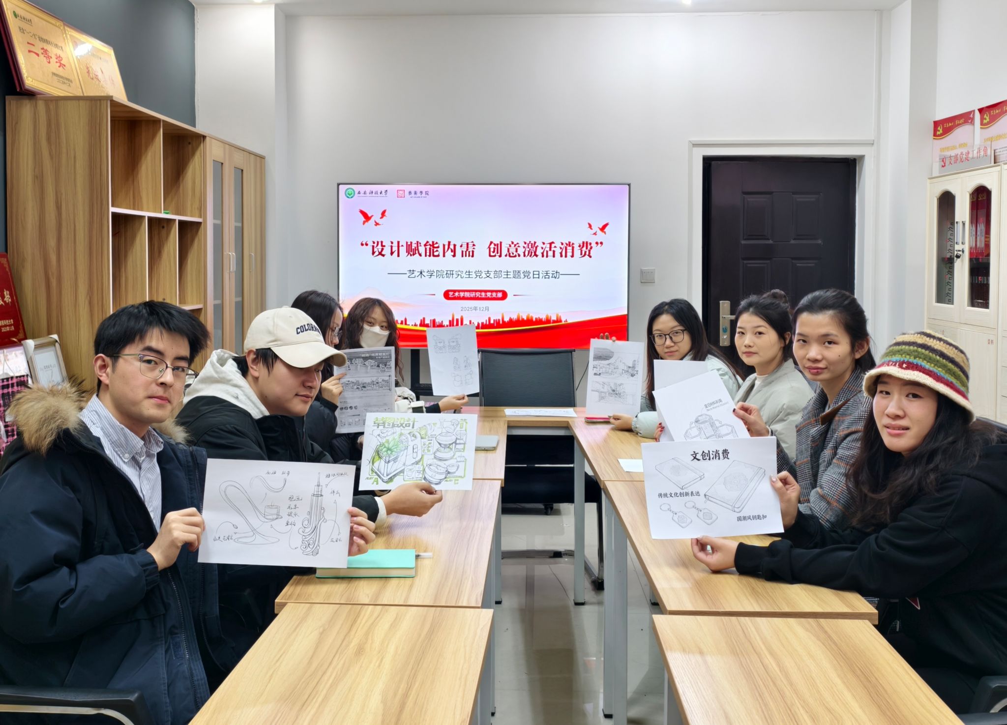 为深入学习贯彻国家扩大内需战略部署,推动专业优势与国家发展需求深度融合,12月24日,艺术学院研究生党支部以“设计赋能内需,创意激活消费”为主题开展特色党日活动。活动创新采用“理论研学+创意实践+交流研讨”三维联动模式,引导支部党员将设计理想融入发展大局,以专业力量助力消费升级与内需拓展,取得良好成效。
